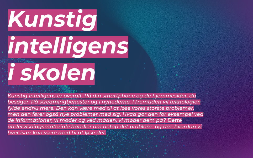 Undervisningsmaterialet Kunstig intelligens i skolen er målrettet grundskolens udskoling samt ungdomsuddannelser og belyser emnet fra flere perspektiver, men særligt med fokus på kildekritik i forbindelse med brug af redskaber, der er drevet af kunstig intelligens, herunder chatbots.