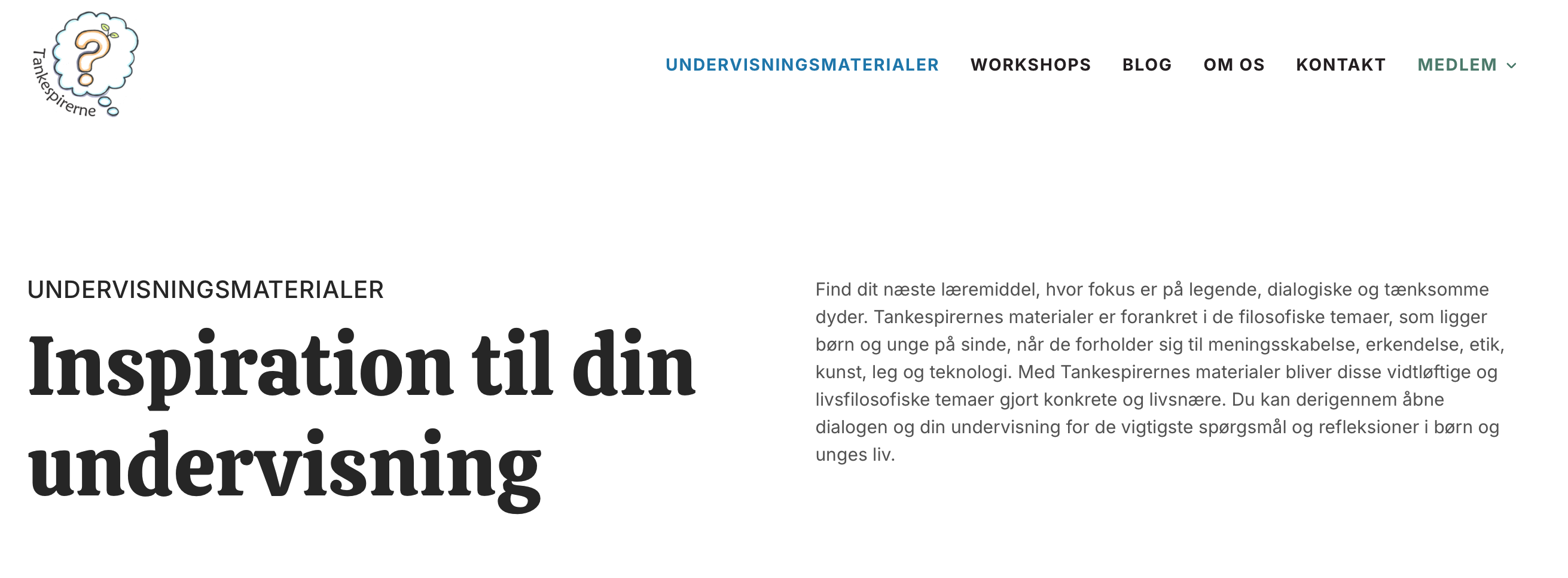 Find dit næste læremiddel, hvor fokus er på legende, dialogiske og tænksomme dyder. Tankespirernes materialer er forankret i de filosofiske temaer, som ligger børn og unge på sinde, når de forholder sig til meningsskabelse, erkendelse, etik, kunst, leg og teknologi. Med Tankespirernes materialer bliver disse vidtløftige og livsfilosofiske temaer gjort konkrete og livsnære. Du kan derigennem åbne dialogen og din undervisning for de vigtigste spørgsmål og refleksioner i børn og unges liv.